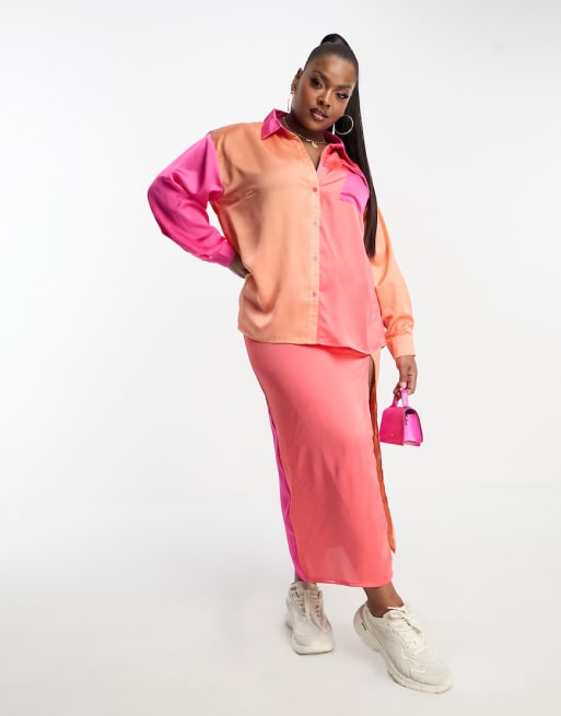 In The Style Plus satin contrast shirt and skirt co-ord in multi