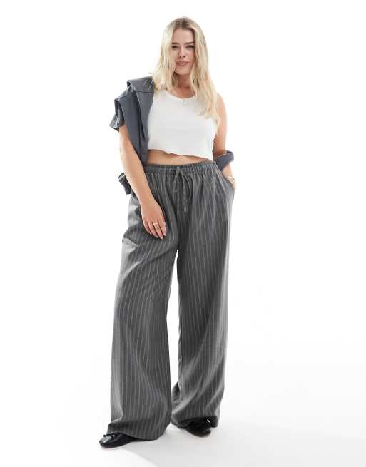 In The Style Plus x Perrie Sian exclusive wide leg drawstring trouser in grey pinstripe