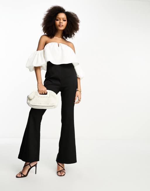 In The Style bardot puff sleeve flared jumpsuit in black and white