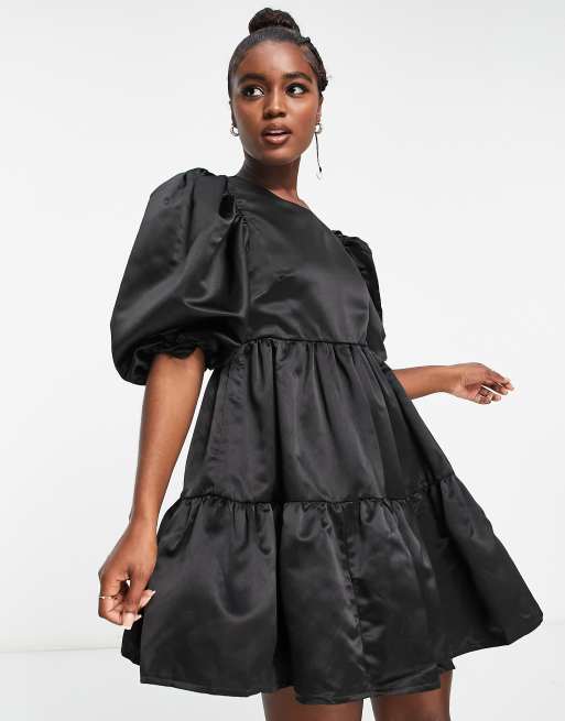 In The Style exclusive satin puff sleeve tiered mini prom dress in black