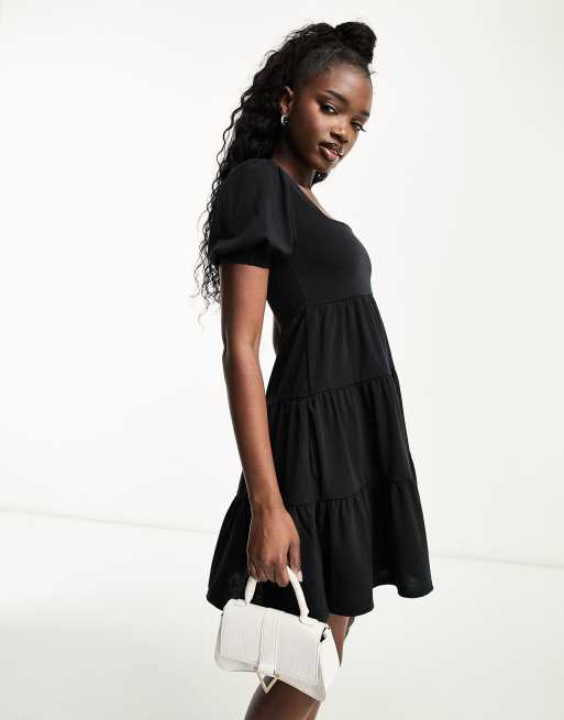 In The Style exclusive tiered mini dress with shirred back detail in black