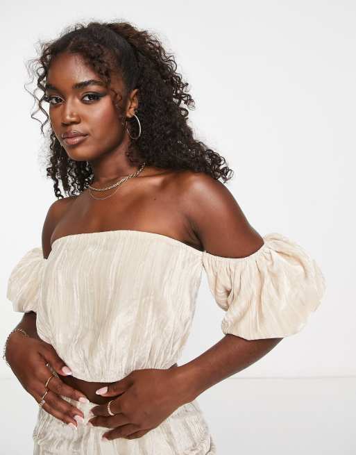 In The Style off shoulder puff sleeve crop top co-ord in camel