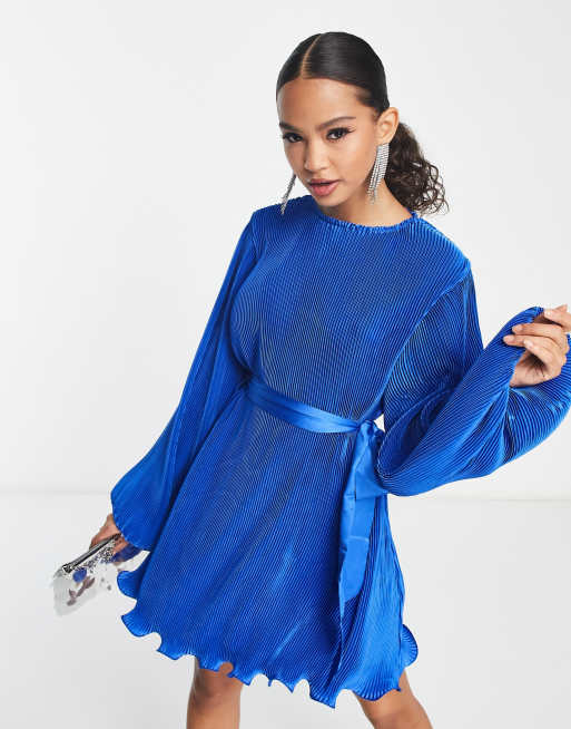 In The Style pleated sleeve volume swing dress with belt detail in blue