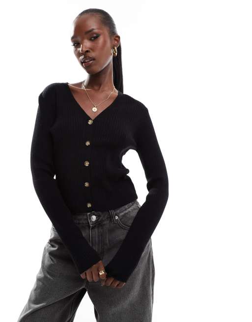 In The Style ribbed knit button through fitted cardigan in black