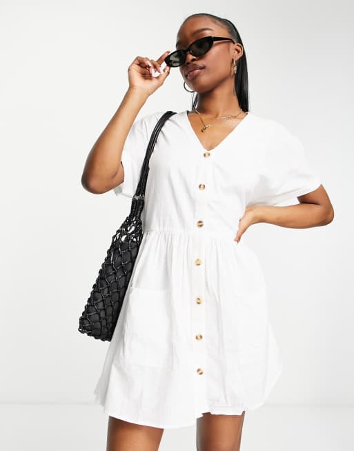 In The Style Stacey Solomon linen look flare button through smock dress in white
