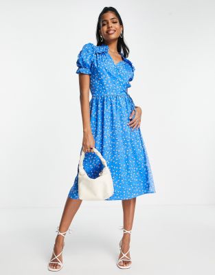 In The Style x Jac Jossa wrap detail frilly sleeve belted midi dress in navy floral