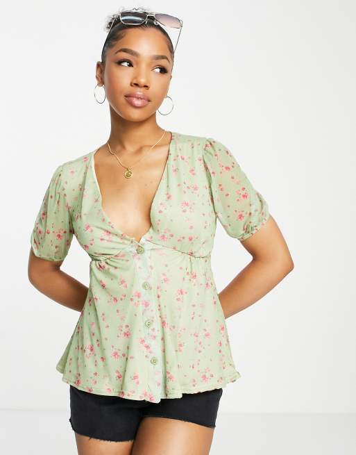 In The Style x Perrie Sian puff sleeve button front blouse in lime floral print