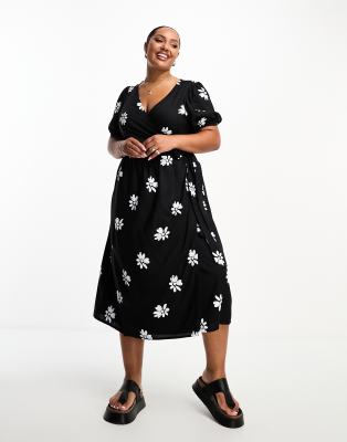 Influence Plus wrap front midi dress in monochrome floral print