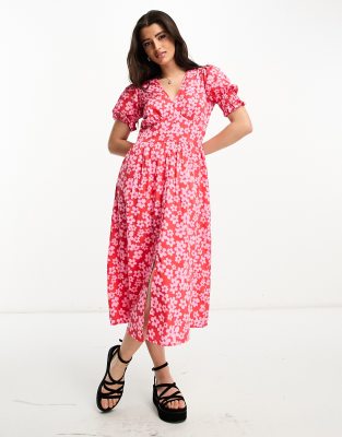 Influence button front midi dress in pink and red floral print