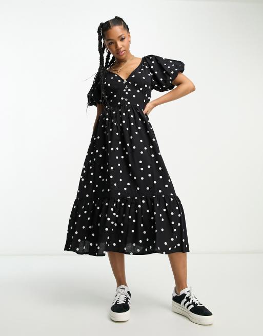 Influence puff sleeve midi dress in monochrome polka dot
