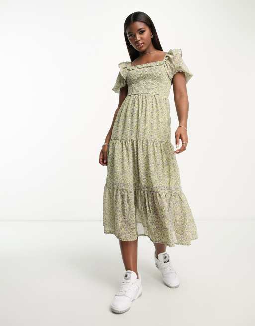 Influence puff sleeve tiered chiffon midi dress in sage green