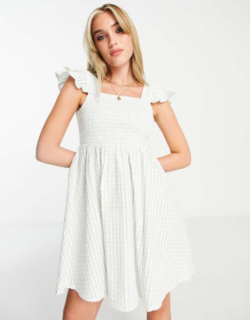 Influence shirred bust frill sleeve mini swing dress in sage gingham
