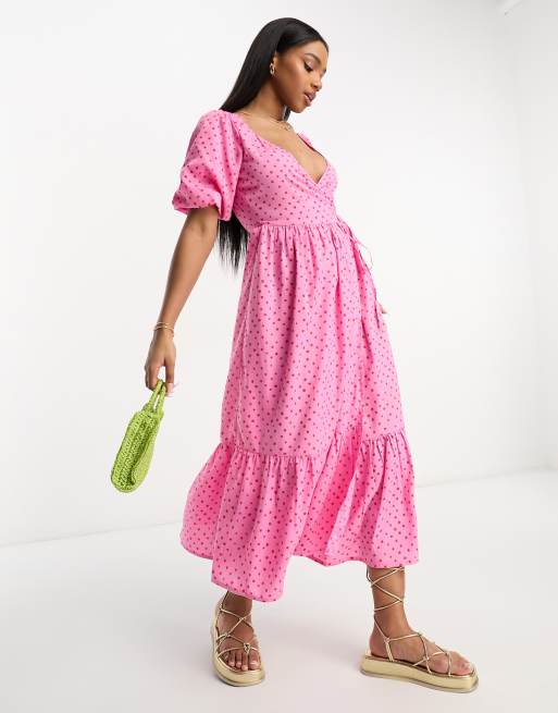 Influence wrap front midi dress in pink polka dot
