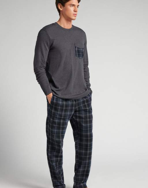 Intimissimi Check print long cotton pyjamas in navy grey tartan