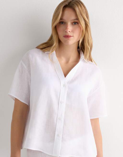 Intimissimi Plain-weave linen short-sleeved shirt in white
