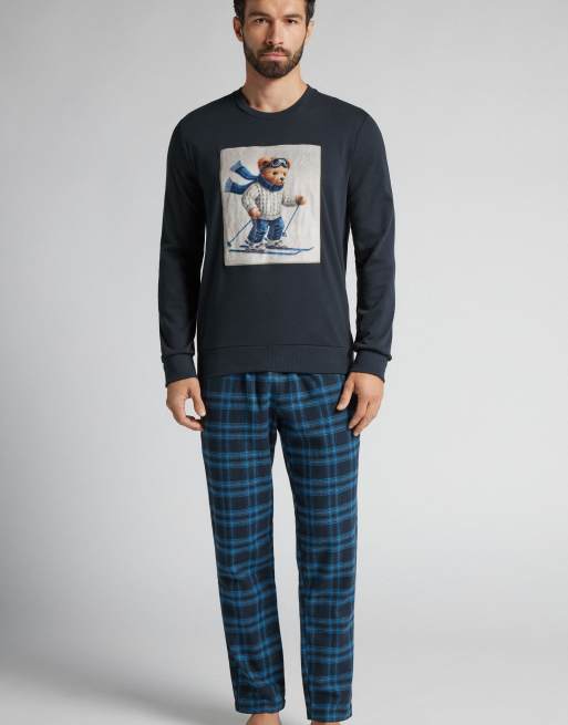 Intimissimi Ski bear print long cotton pyjamas in midnight blue