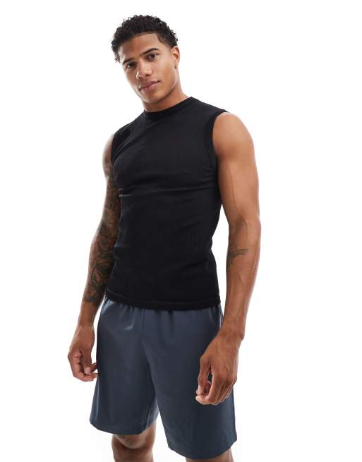 4505 - Top senza maniche da allenamento nero attillato a coste senza cuciture