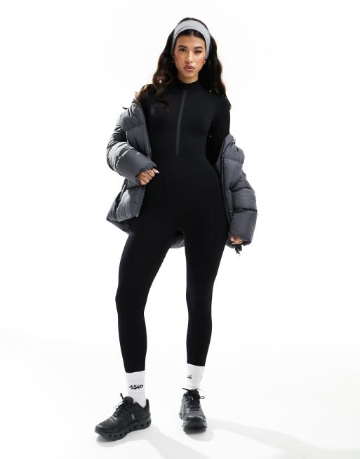 ASOS 4505 - Tuta intera a maniche lunghe nera a coste senza cuciture con zip sul davanti
