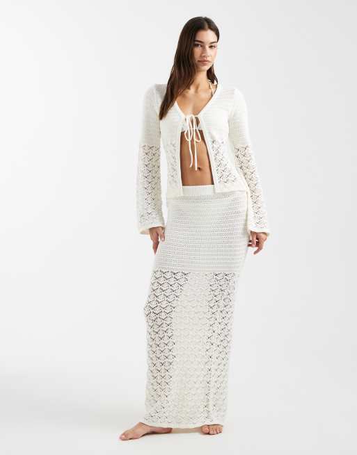4th & Reckless - Coordinato con top con maniche ampie e allacciatura frontale e gonna lunga da mare all'uncinetto bianca