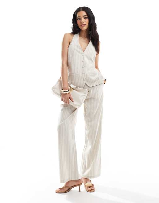 4th + Reckless - Coordinato sartoriale in misto lino beige a righe con gilet allacciato al collo e sul retro e pantaloni con fondo ampio
