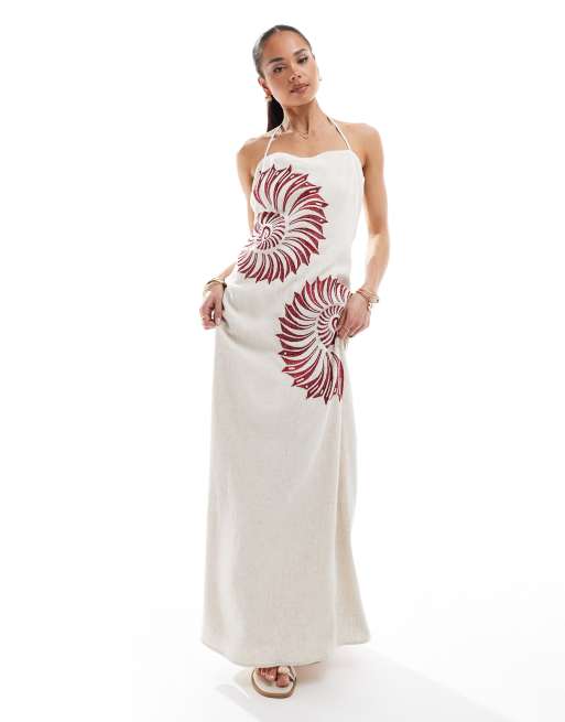 4th + Reckless - Vestito lungo allacciato al collo in misto lino beige con conchiglie marroni ricamate
