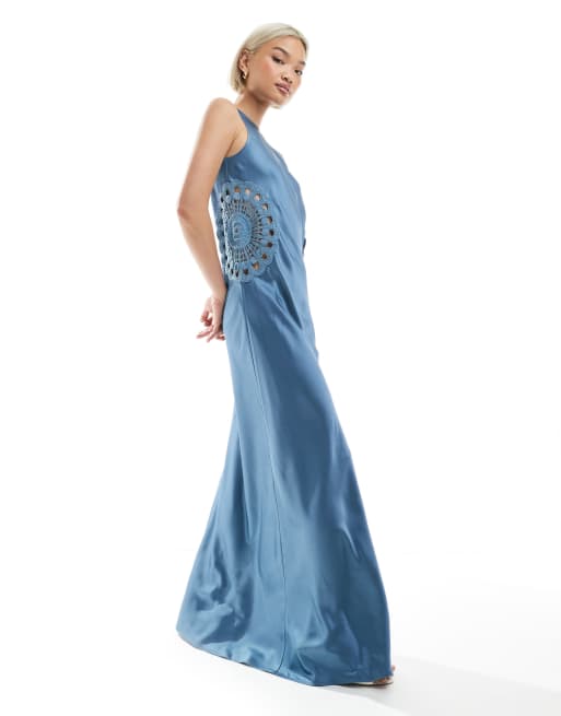 4th & Reckless - Vestito lungo in raso blu con scollo a vogatore e inserto all'uncinetto