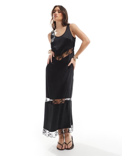 4th & Reckless - Vestito lungo nero in raso con inserti trasparenti in pizzo