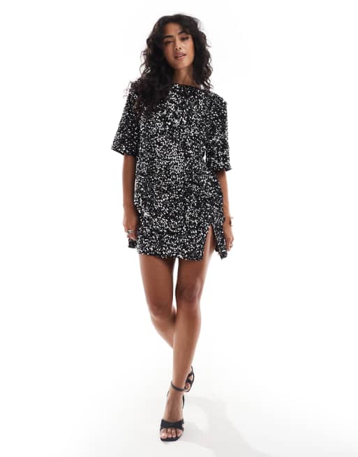 4th + Reckless - Vestito t-shirt corto in velluto nero con paillettes e aperto dietro