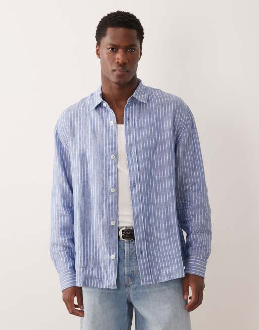 Abercrombie & Fitch - Camicia a maniche lunghe blu a righe in 100% lino