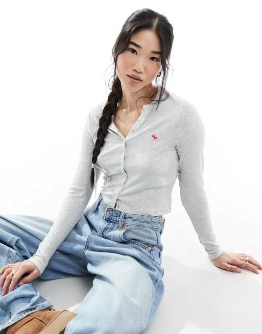 Abercrombie & Fitch - Top serafino a maniche lunghe grigio con logo