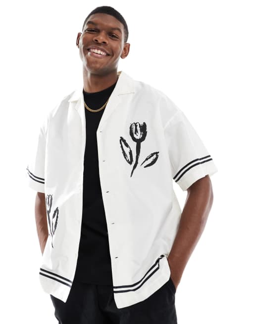 ADPT - Camicia oversize con colletto con rever bianca con stampa di fiori