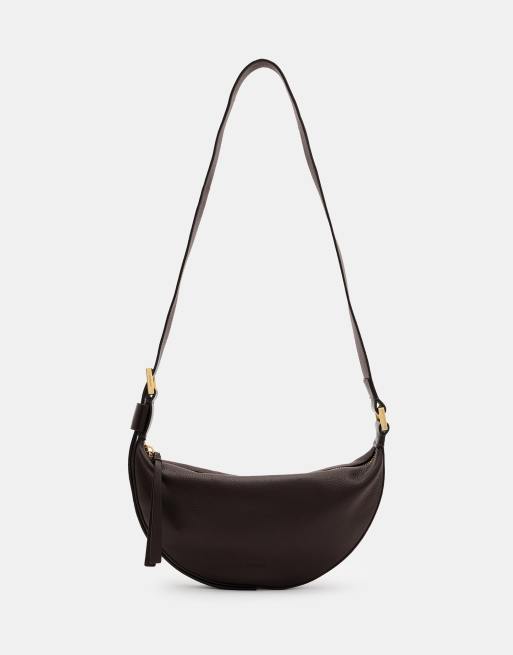 AllSaints - Borsa a tracolla a mezza luna in pelle marrone cioccolato