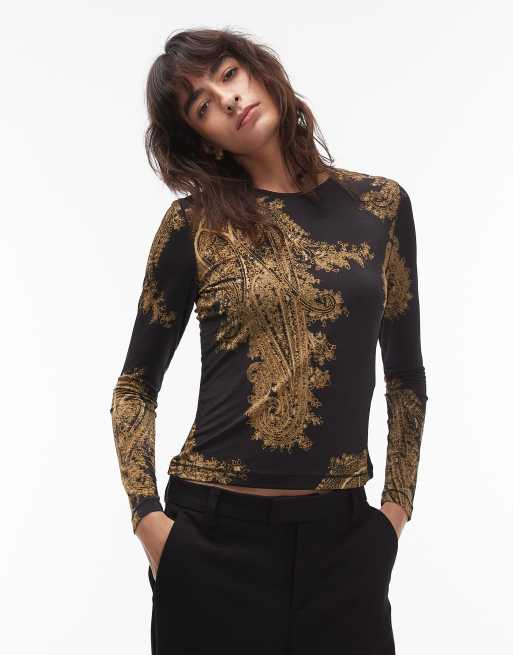 AllSaints - Katlyn - Top a maniche lunghe nero e oro con stampa