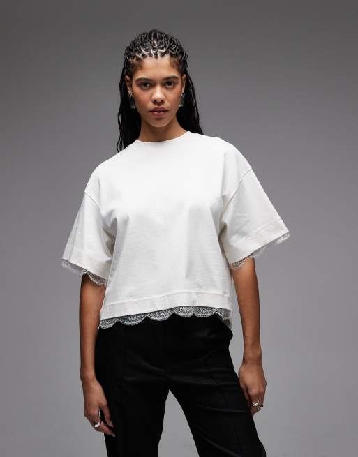 AllSaints - Nia - T-shirt corta bianca con finiture in pizzo