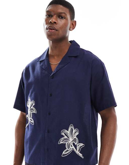 Aray - Camicia da mare blu navy con ricamo stile resort