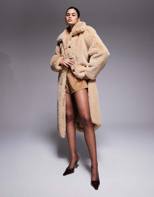 Aria Cove - Cappotto lungo in pelliccia sintetica color cammello con colletto, cintura e bottoni