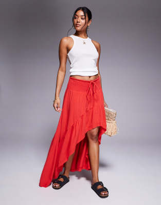 Aria Cove - Gonna lunga asimmetrica rossa in misto lino con vita arricciata
