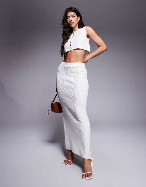 Aria Cove - Gonna lunga in maglia crema a coste con spacco sul retro in coordinato