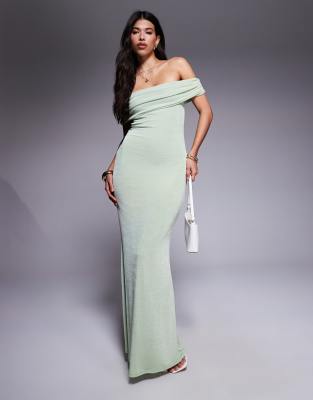 Aria Cove - Vestito lungo verde arricciato sinuoso con scollo Bardot