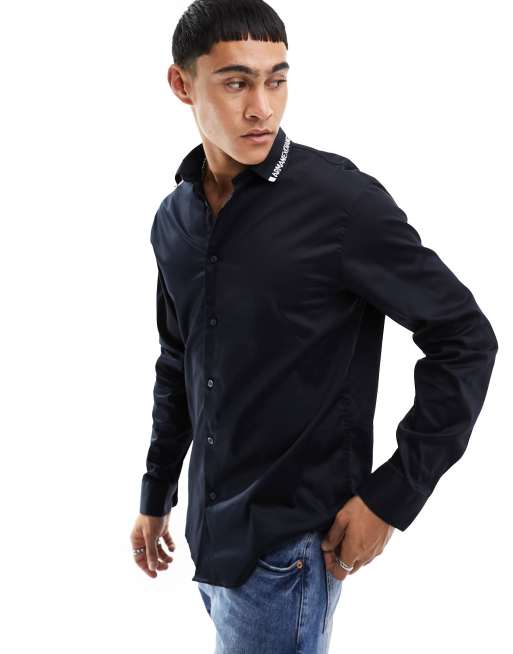 Armani Exchange - Camicia in maglia in popeline di cotone blu navy con colletto con logo a contrasto