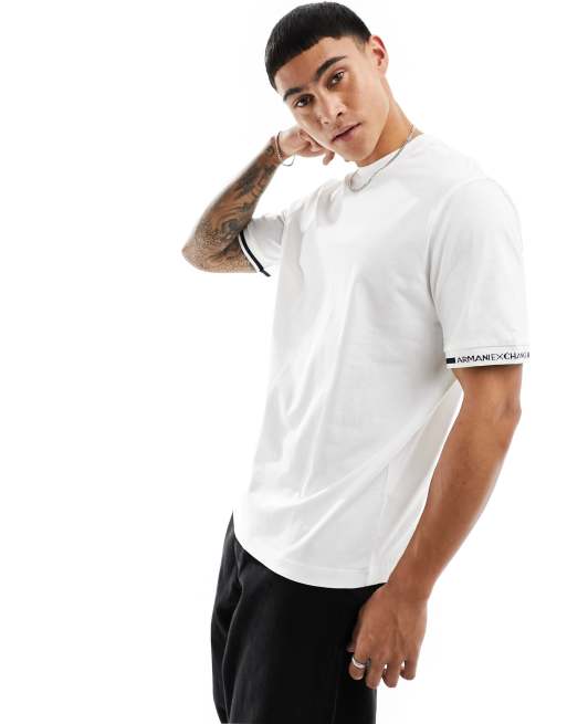 Armani Exchange - T-shirt pesante bianco sporco con logo sulle fettucce sui polsini