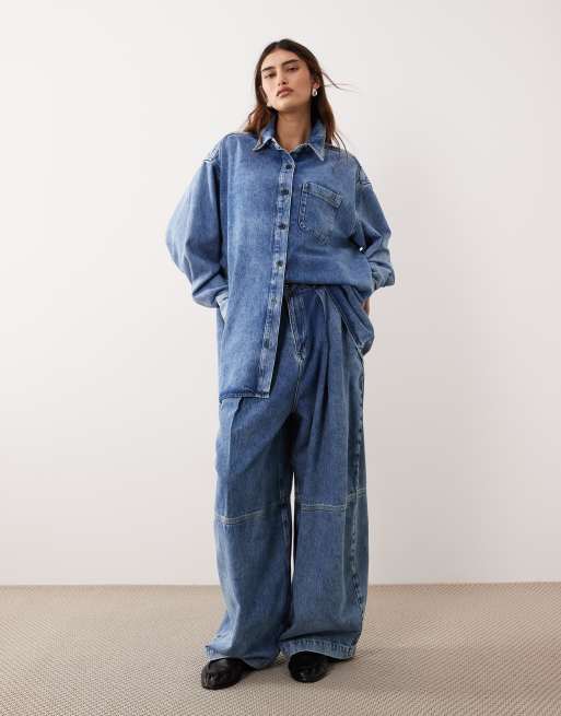 ARRANGE - Coordinato in denim lavaggio blu medio con camicia e jeans bombati