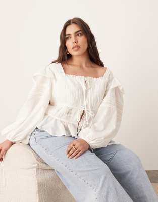 ARRANGE Curve - Blusa bianca in voile di cotone con finiture in pizzo e laccetti frontali
