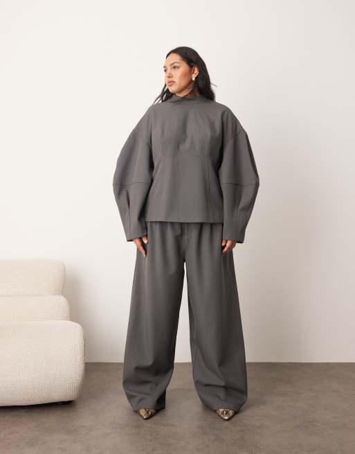 ARRANGE Curve - Top sartoriale strutturato con cuciture a vista e maniche ovoidali e pantaloni a cilindro a fondo ampio grigi