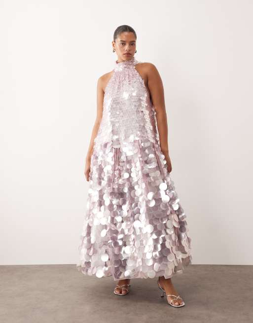 ARRANGE Curve - Vestito lungo a trapezio lilla allacciato al collo con paillettes a disco