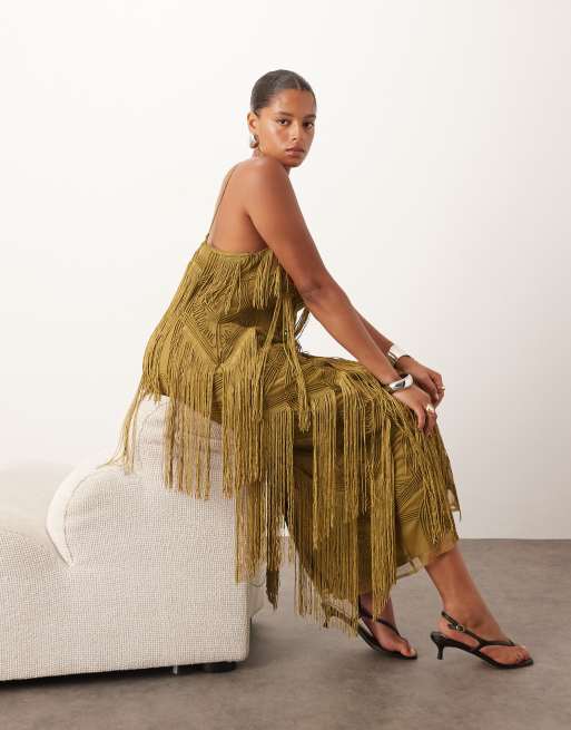 ARRANGE Curve - Vestito lungo verde muschio a colonna con spalline sottili, frange e motivo geometrico