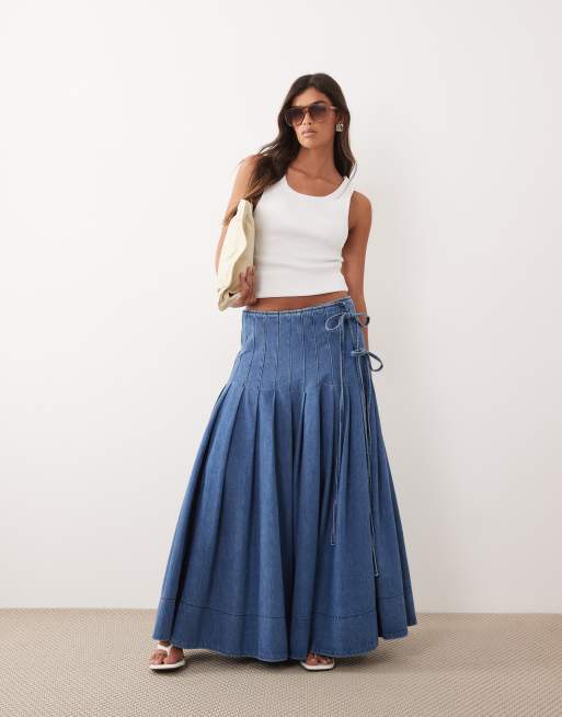 ARRANGE - Gonna midi di jeans a pieghe blu con laccetti