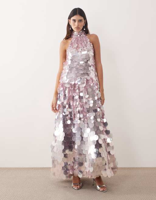 ARRANGE - Vestito lungo a trapezio lilla allacciato al collo con paillettes a disco