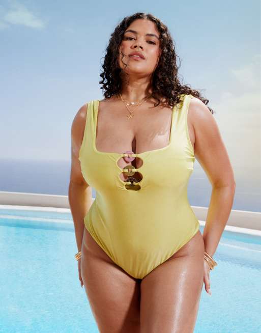 ASOS DESIGN Curve - Bella - Costume da bagno testurizzato color chartreuse acceso con anello con perline