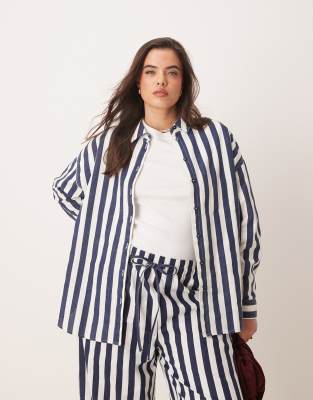 ASOS DESIGN Curve - Camicia oversize effetto lino a righe blu navy in coordinato